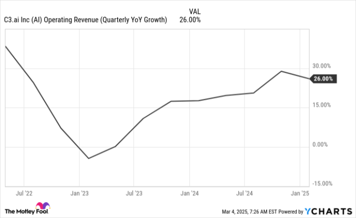 For the three-month interval ending Jan. 31, C3.ai’s gross sales rose by 26% to $98.8 million. Whereas that is a powerful charge of progress, it marks a slowdown from the earlier interval. That is necessary as a result of the massive attract of investing in C3.ai is for its promising progress prospects, particularly on account of AI.