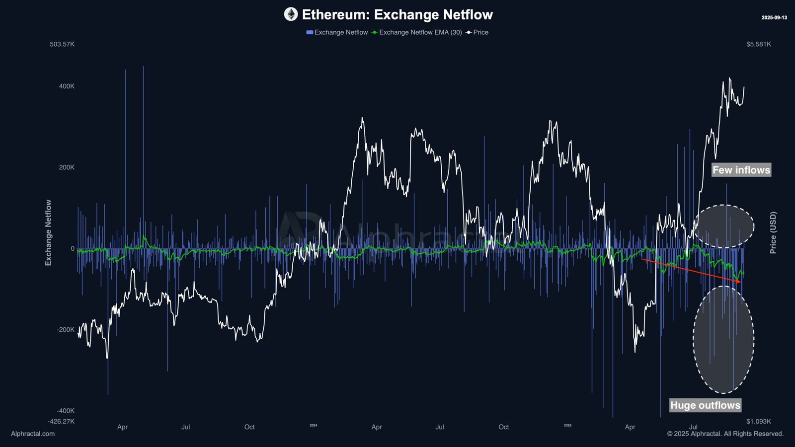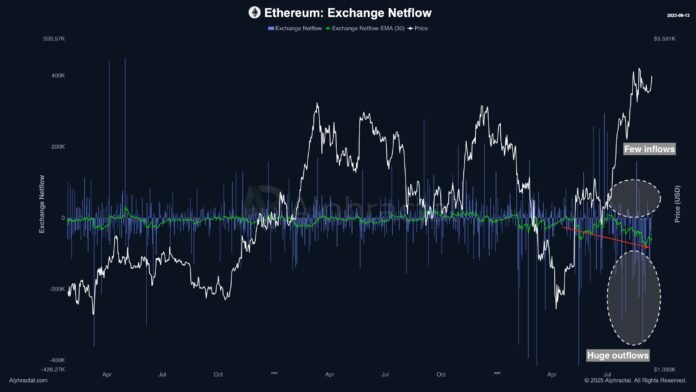 เมื่อเร็ว ๆ นี้มีหลายวันที่ถอน ETH มากกว่า 400,000 ครั้ง สิ่งที่น่าสนใจยิ่งกว่าคือการแลกเปลี่ยน NetFlows ไม่ได้เป็นบวกตั้งแต่เดือนกรกฎาคม
