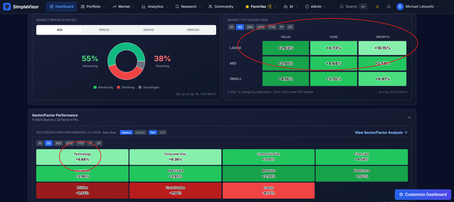กราฟิกแรกด้านล่างจาก SimpleVisor AI ที่จะเปิดตัวเร็วๆ นี้ แสดงให้เห็นถึงประสิทธิภาพที่เหนือกว่าหุ้นที่มีการเติบโตขนาดใหญ่เหนือหุ้นมูลค่าในช่วงห้าวันที่ผ่านมา นอกจากนี้ ยังแสดงให้เห็นว่าภาคเทคโนโลยีเพิ่มขึ้นเกือบ 10% ในช่วงเวลานี้ ในขณะที่อดีตผู้นำตลาด ลวดเย็บกระดาษ และสาธารณูปโภคลดลง แม้ว่าตลาดจะพุ่งสูงขึ้นก็ตาม เพื่อช่วยประเมินว่าการค้าที่มีมูลค่ามากกว่าการเติบโตนั้นตายไปแล้วหรือเพียงแค่หยุดพัก เราได้แบ่งปันมุมมองระยะยาวบางส่วนในกราฟิกที่สอง