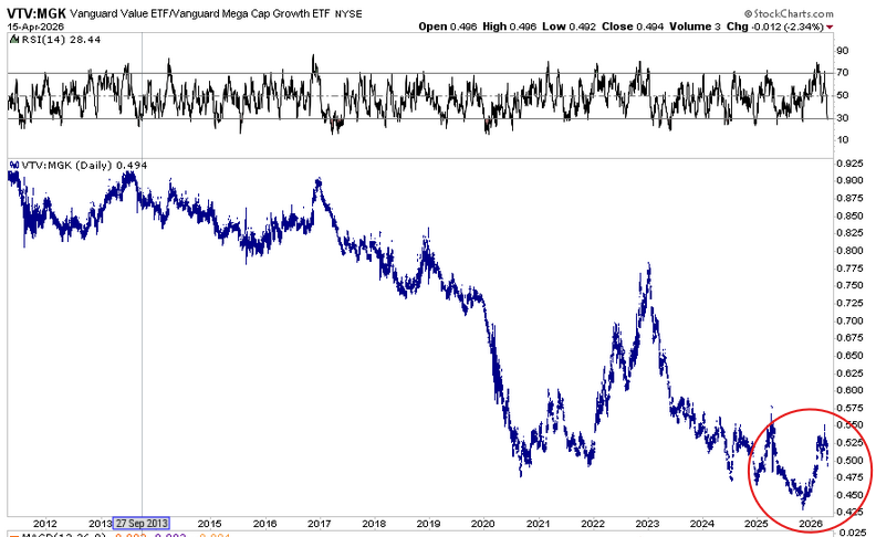 กราฟแสดงอัตราส่วนราคาระหว่าง ETF มูลค่าขนาดใหญ่ของ Vanguard และ ETF ที่มีการเติบโตขนาดใหญ่ของ Vanguard แนวโน้มในช่วง 15 ปีที่ผ่านมาลดลง กล่าวคือ การเติบโตมีประสิทธิภาพเหนือกว่ามูลค่าอย่างมาก ที่มุมขวาล่าง เราเห็นมูลค่าที่สูงกว่าการเติบโตซึ่งเริ่มในเดือนพฤศจิกายนเกือบ 20% ประสิทธิภาพที่เหนือกว่าการเติบโตเหนือมูลค่าล่าสุดได้ลบล้างประมาณหนึ่งในสามของการเคลื่อนไหว ประสบการณ์ในปัจจุบันจะเหมือนกับมูลค่าชั่วคราวที่เหนือกว่าในช่วงเหตุการณ์วันปลดปล่อยหรือจะยั่งยืนมากขึ้นดังที่เราเห็นในปี 2565? ก่อนที่จะพิจารณาคำถามของเรา เป็นที่น่าสังเกตว่าภาคมูลค่าที่แท้จริงคือเทคโนโลยีและการเติบโตของ mega-cap ดังที่แสดงในกราฟที่สาม