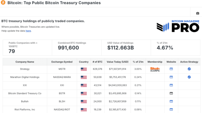 Analyzing the desk of Prime Public Bitcoin Treasury Corporations reveals a complete of 79 public firms maintain not less than 100 BTC, amounting to virtually 1,000,000 Bitcoin, valued at over $110 billion. A monumental quantity, contemplating a majority of those firms solely began accumulating prior to now couple of years!