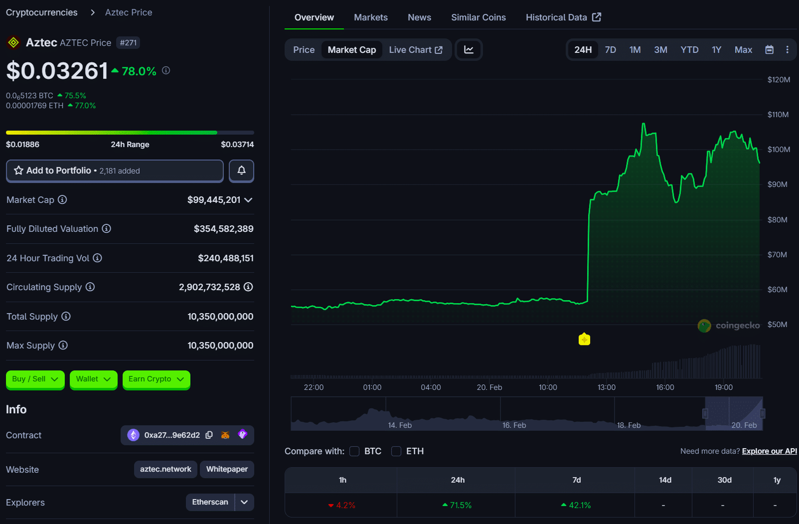 AZTEC ซื้อขายที่ $0.033 เพิ่มขึ้น 73% ใน 24 ชั่วโมงที่ผ่านมา CoinGecko ข้อมูล การแสดง