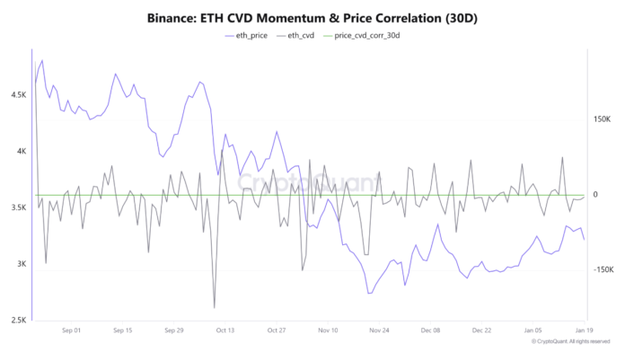 Arab Chain ตั้งข้อสังเกตว่าแม้ว่า CVD ของ Ethereum ยังคงเป็นลบ แต่ความสัมพันธ์ระหว่างราคาและกระแสสภาพคล่องยังไม่เสียหายอย่างสมบูรณ์ ตามรายงาน ความสัมพันธ์ในช่วง 30 วันระหว่างราคา ETH และ CVD อยู่ที่ประมาณ 0.62 ซึ่งเป็นการอ่านที่ค่อนข้างสร้างสรรค์ รูปแบบนี้แนะนำ การเคลื่อนไหวของราคานั้นบางส่วน จัดตำแหน่ง ด้วยพฤติกรรมด้านปริมาณแม้ว่าปัจจุบันจะมีสภาพคล่องก็ตาม เอียง ไปสู่การขายมากกว่าการซื้อสด