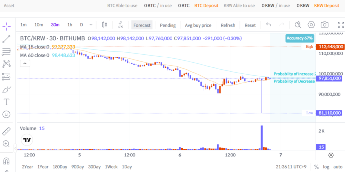 ราคาของ Bitcoin บน Bithumb ดีดตัวขึ้นมาเหนือระดับ 66,000 ดอลลาร์ (KRW 98 ล้าน) เพิ่มขึ้นจากระดับต่ำสุดประมาณ 56,000 ดอลลาร์ (KRW 82 ล้าน)