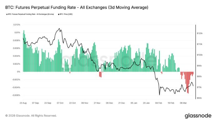 In March to date, BTC has discovered some stability and made some restoration, however from the chart, it’s seen that the market expectations have now flipped, with shorts as an alternative dominating. This additionally didn’t change throughout BTC’s latest rally above $75,000.