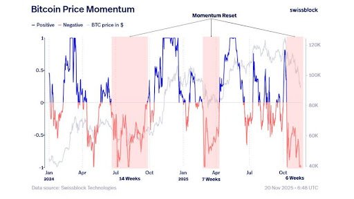In an X submit, Swissblock has talked about that Bitcoin momentum is clearly in a reset section, and the query now’s how lengthy till it flips. Traditionally, in late February to early April 2025, the underside required roughly 7 weeks for a full momentum to reset. Transferring additional again to late June to late September 2024, the correction took near 14 weeks for a full reset and consolidation earlier than a transparent pattern emerged.