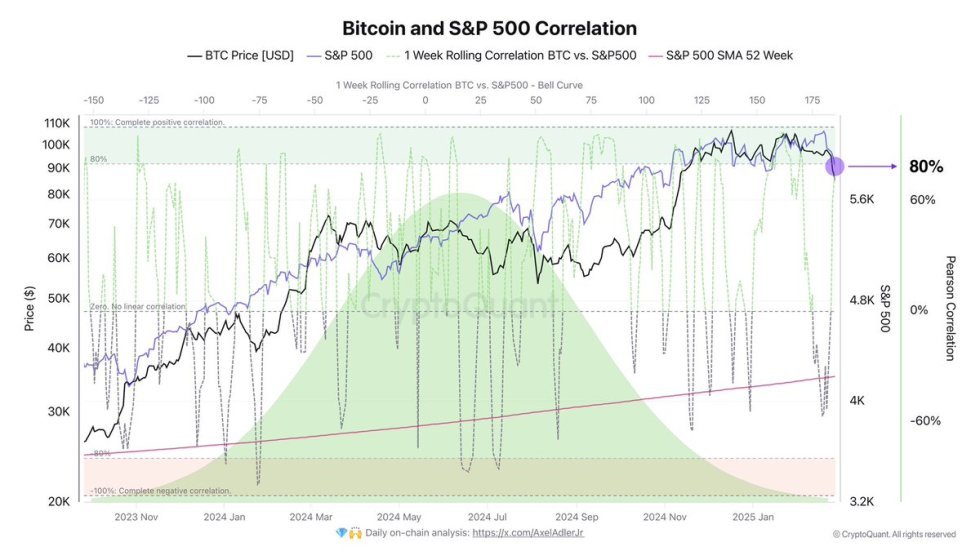 Prime analyst Axel Adler shared an evaluation on X, revealing that the S&P 500 is more likely to pull again one other 5% primarily based on the macro studies he learn. That is vital as a result of Bitcoin at present has an 80% correlation with the index, which means that any additional draw back in conventional markets might immediately influence BTC’s worth motion. If Adler’s prediction is correct, Bitcoin is more likely to proceed its worth drops, with a possible transfer into decrease demand ranges.