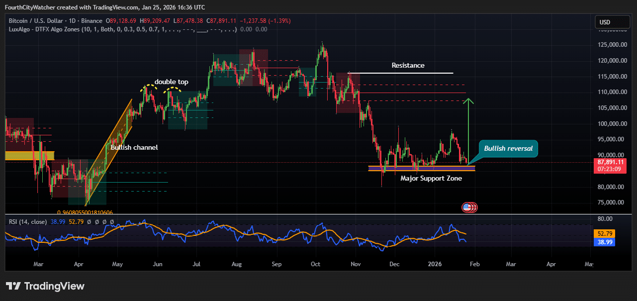 The Bitcoin buying and selling pair exhibits the market testing a important juncture on the main help zone close to $87,000. After a chronic downtrend ranging from mid-2025, BTC seems to be forming a possible bullish reversal, as highlighted by the chart.