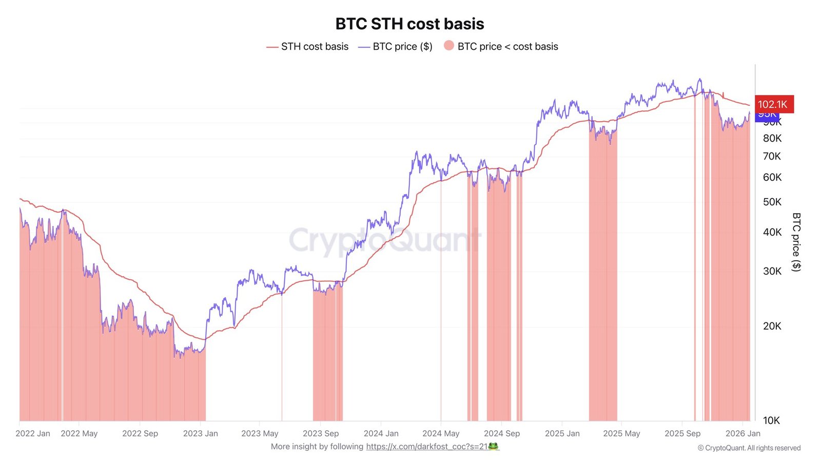 Darkfost mentioned that the Bitcoin value buying and selling under this price foundation traditionally represents a superb accumulation alternative. Nonetheless, the analyst warned that bear market intervals must be excluded, as short-term holders are inclined to witness extended drawdowns and ache throughout this season.