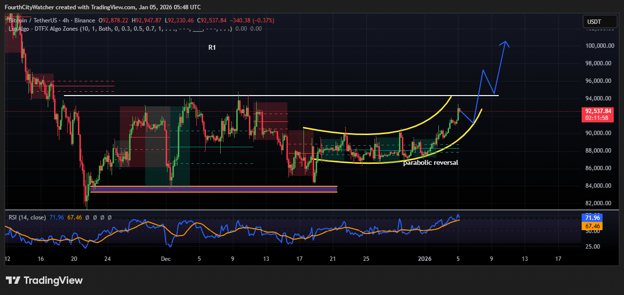 Bitcoin is buying and selling at $92,500, exhibiting sturdy bullish momentum after a interval of slower motion. The chart shows a parabolic reversal sample, which often alerts accelerating upward momentum. The curved yellow line on the chart highlights the acceleration in value, suggesting patrons are stepping in additional aggressively.