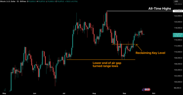 On-chain knowledge present that Bitcoin now trades above the associated fee foundation of 95 p.c of provide (~$115,200), restoring profitability for many holders. Sustaining this degree is vital to sustaining momentum; a drop beneath might invite renewed promoting strain and retest the $105,500–$115,200 vary.