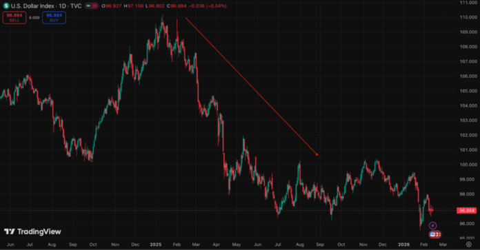 Bitcoin is making an attempt to stabilise after the 5 February capitulation occasion, which drove the worth to an area low of $60,100. The macro backdrop has turned constructive. Headline CPI cooled to beneath expectations, reinforcing the narrative that disinflation is gaining traction. Treasury yields declined, the greenback softened, and charge markets repriced towards three potential cuts in 2026, with April more and more favoured for the primary transfer. For non-yielding property comparable to Bitcoin, this shift in actual yield expectations reduces macro headwinds.
