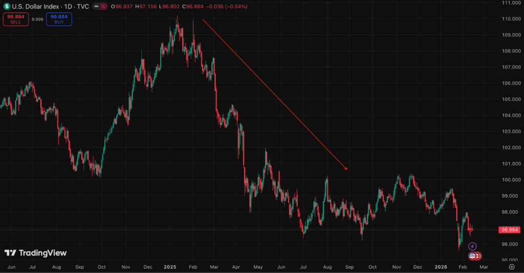 Alongside these macro dynamics, the Federal Reserve has shifted from shrinking its stability sheet to increasing it modestly. Funding market indicators, together with the unfold between the Secured In a single day Financing Price and the Curiosity on Reserve Balances (IORB), signalled tightening reserves, prompting renewed Treasury purchases to stabilise liquidity. This growth is operational moderately than stimulative, however increasing reserves are likely to help monetary situations, cushion danger property and apply gradual structural stress on the US greenback.