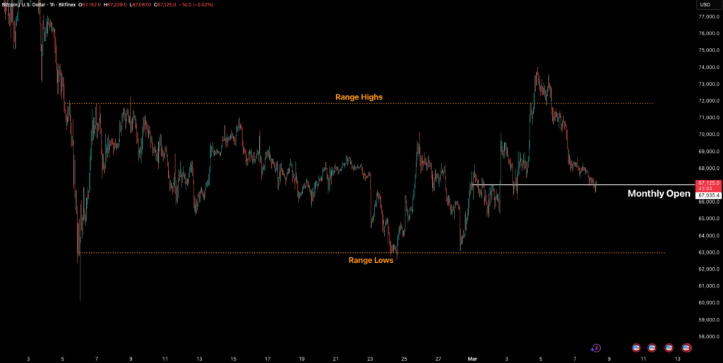 Bitcoin’s early March rally misplaced momentum with a short break to $74,047, earlier than reversing and sending value again towards the month-to-month open close to $67,000. The transfer underscores how firmly the $62,500–$72,000 vary continues to outline market construction following February’s capitulation.