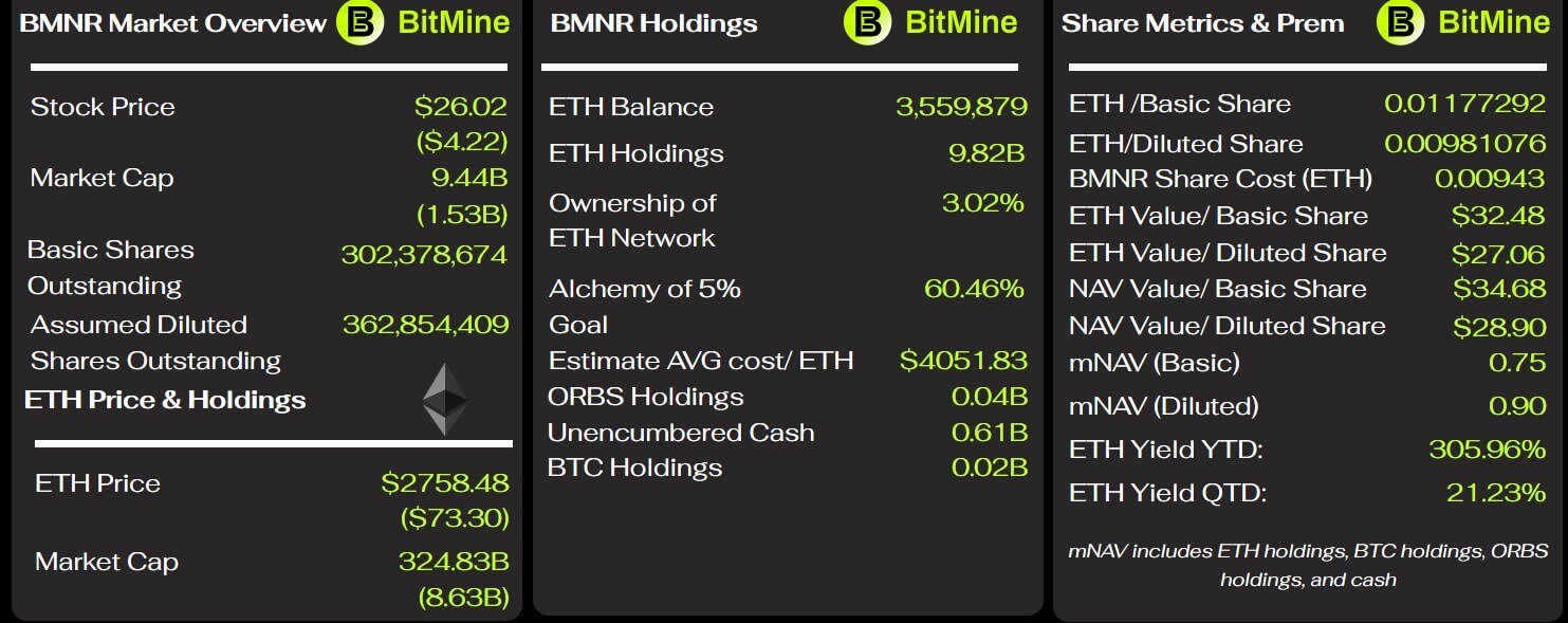 ตาม BitMineTrackermNAV พื้นฐานของ BitMine ตอนนี้อยู่ที่ 0.75 โดยมี mNAV ปรับลดอยู่ที่ 0.90 ตัวเลขเหล่านี้ส่งสัญญาณว่าตลาดให้ความสำคัญกับบริษัทโดยมีส่วนลดอย่างมากจากสกุลเงินดิจิทัลที่บริษัทถืออยู่