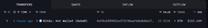 ตาม ข้อมูล แบ่งปันโดย Lookonchain การสะสมของสถาบันรอบ ๆ Ethereum ยังคงแข็งแกร่ง แม้จะมีความผันผวนของตลาดในช่วงที่ผ่านมา เมื่อไม่กี่ชั่วโมงที่แล้ว Bitmine ได้รับอีก 23,823 ETH (มูลค่า 103.68 ล้านดอลลาร์) จาก BitGo ซึ่งถือเป็นการไหลเข้าของเงินทุนที่สำคัญอีกครั้งหนึ่ง การเคลื่อนไหวนี้เกิดขึ้นเพียงสองวันหลังจากที่ Bitmine ได้รับ 20,020 ETH ($89.7 ล้าน) ผ่าน FalconX ซึ่งตอกย้ำกลยุทธ์ที่สอดคล้องกันในการสร้างการเปิดเผยในช่วงราคาที่ลดลง แทนที่จะไล่ตามการชุมนุม