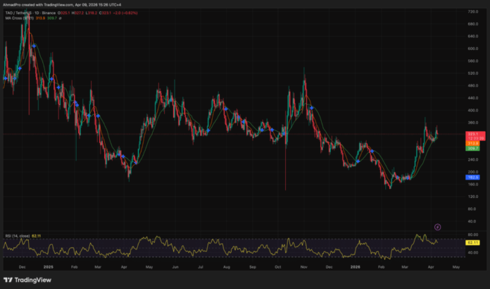 TAO crypto is presently buying and selling at $334, up roughly 90% from its March lows, with 24-hour quantity sitting at 244,000 – sustained accumulation relatively than a single-session spike.