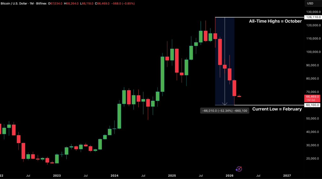 Bitcoin has entered March after some of the structurally extreme corrections in its historical past, recording 5 consecutive month-to-month purple closes for under the second time ever and marking a 52 p.c drawdown from the October 2025 peak. The January–February “double-red” begin to 2026 additionally stands in stark distinction to historic seasonality with the ultimate weekend’s geopolitical shock triggering a pointy liquidation cascade and reinforcing the fragility of danger sentiment. But regardless of the depth of the sell-off, the $60,000–$62,000 area has held agency, suggesting that compelled promoting is transitioning right into a section of absorption fairly than renewed capitulation.