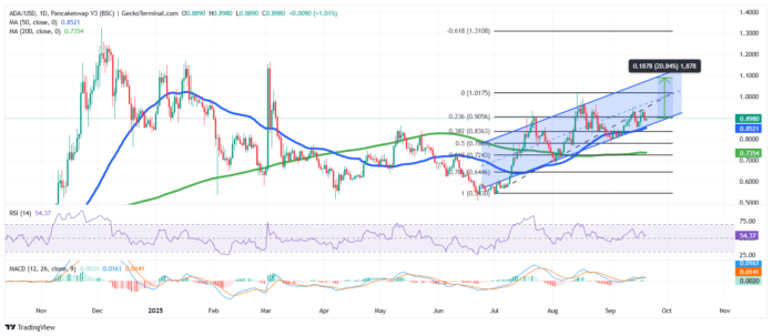 The ADA worth is buying and selling at $0.898, holding firmly inside a rising channel sample that has been in play since mid-July.