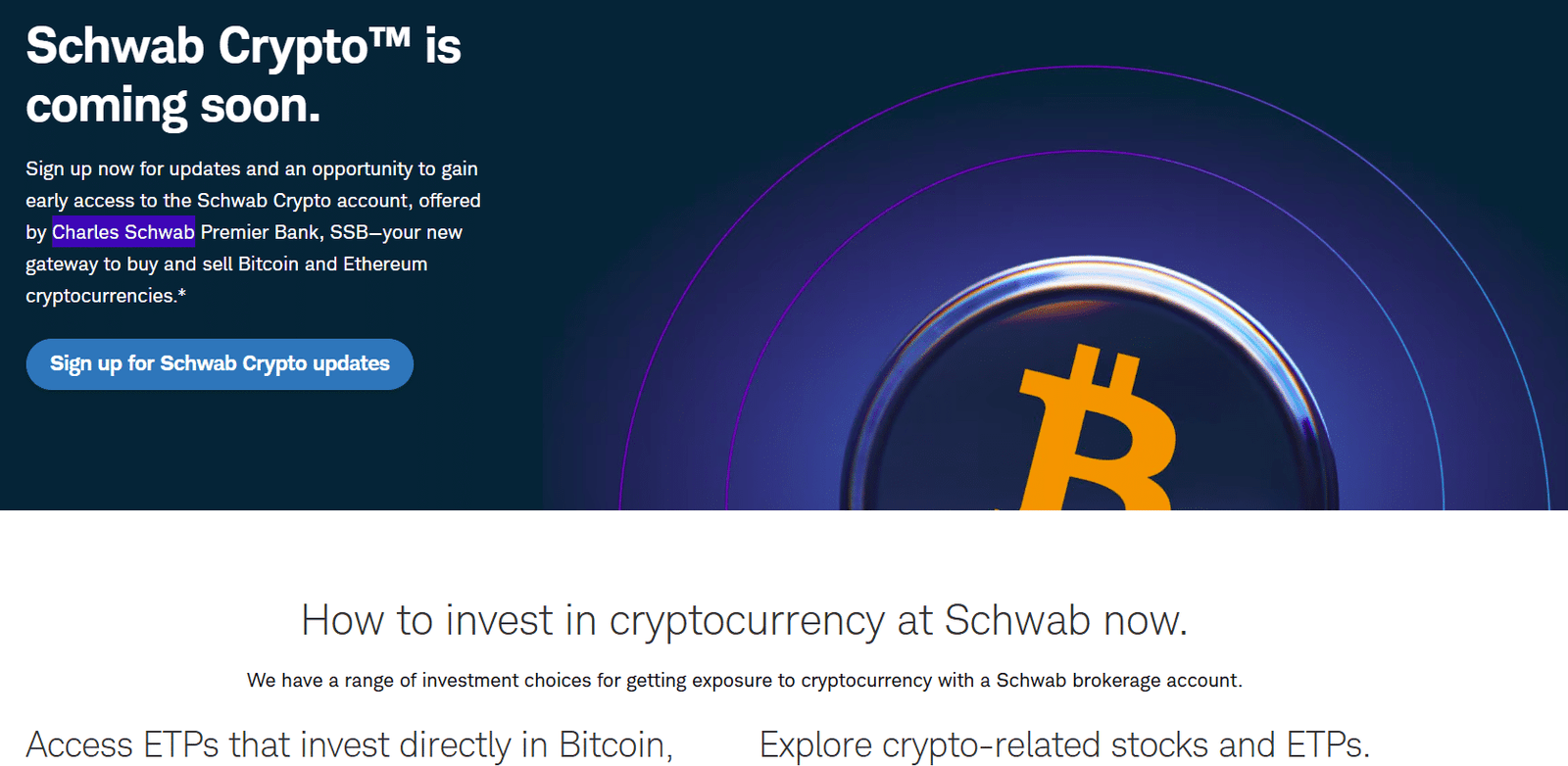 นายหน้าซื้อขายหลักทรัพย์ชั้นนำ Charles Schwab ซึ่งดูแลทรัพย์สินของลูกค้ามากกว่า 12 ล้านล้านดอลลาร์ กำลังเตรียมที่จะเปิดตัวบัญชี Schwab Crypto สำหรับการซื้อและขาย Bitcoin และ Ethereum