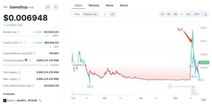 After holding it for 3 months, GME ushered in an increase. He bought 35 million GME for 3,447 SOL ($503,000) at $0.0144 on Might thirteenth and Might 14th. He at the moment holds 111.57 million GME ($781,000), with a complete revenue of ~$593,000.”