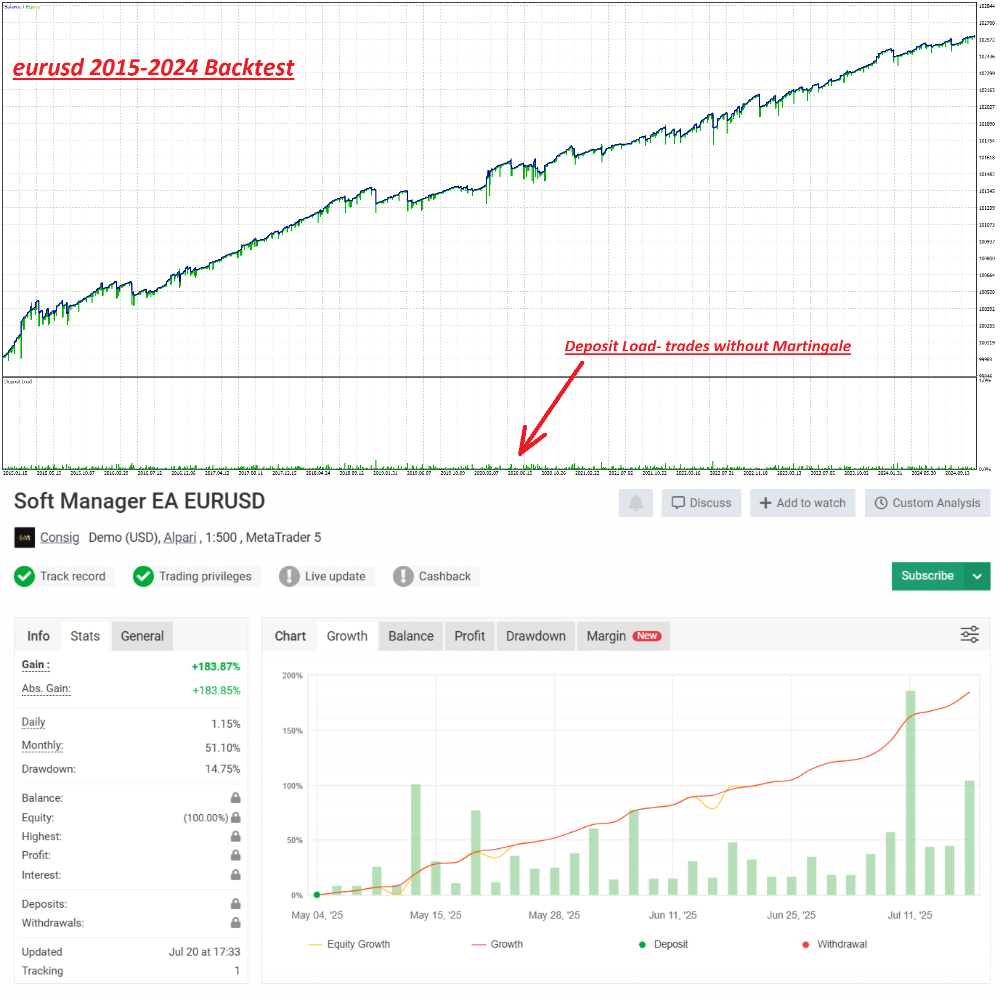 ฉันทำ backtest ให้คุณโดยไม่มี Martingale คุณภาพการทดสอบคือ 100%, 10 ปี EURUSD และยังมี “การทดสอบไปข้างหน้า” ซึ่งมีอยู่นี่คือการตรวจสอบ MyFXBook