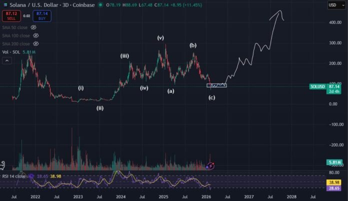 Taking a look at his three-day chart, the analyst means that Solana is bottoming across the $87 degree and will soar to $450 by mid-2027.