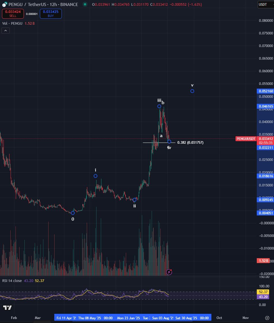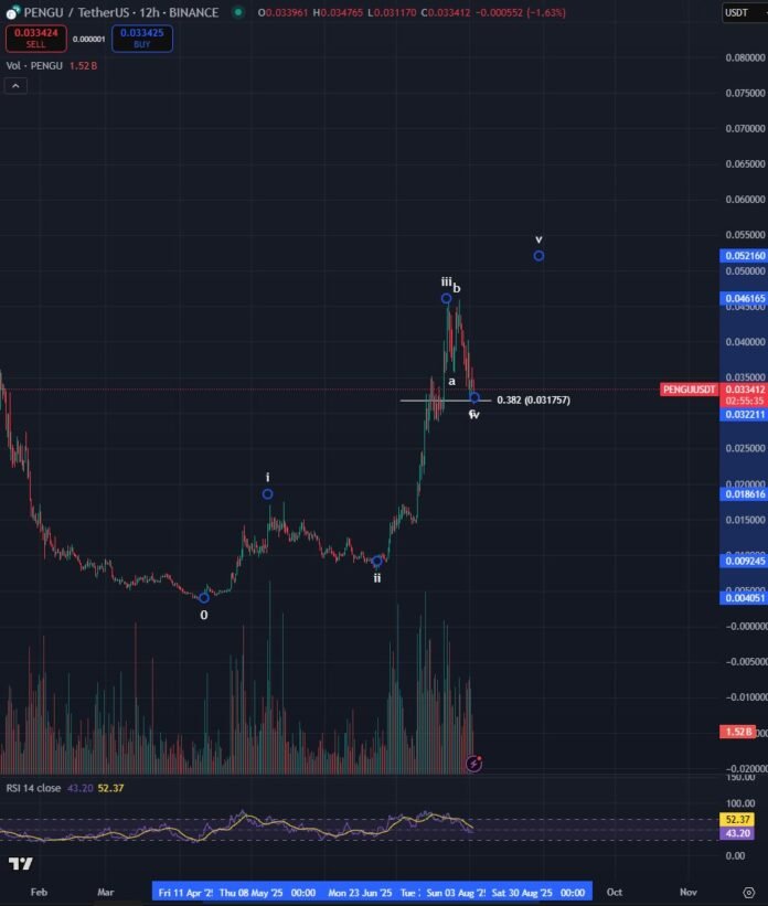 Trying on the dealer’s chart, he appears to foretell that PENGU will soar above $0.05 earlier than ending its five-wave rally. At time of writing, PENGU is price $0.0357, up over 7% up to now day.