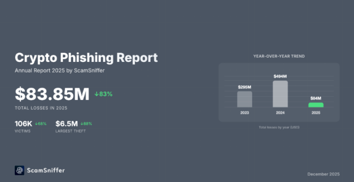 Based on Rip-off Sniffer’s 2025 evaluation, pockets drainer phishing losses fell to about $83.85 million — an 83% decline from roughly $494 million in 2024.