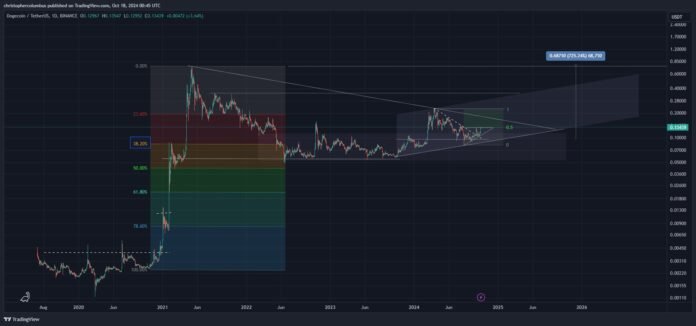 Taking a look at his chart, the analyst seems to additionally recommend that DOGE is consolidating in a broader symmetrical triangle sample and will quickly break by way of resistance that might put the memecoin within the $0.20 vary. Dave the Wave additionally seems to recommend that DOGE will rally near its all-time excessive of $0.73 throughout this cycle.