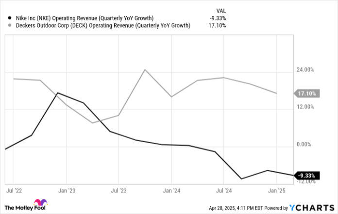 Nike is the behemoth within the footwear trade and has the benefit of being the bigger, rather more recognizable firm. However that hasn’t been translating into higher development in recent times. Deckers has been rising by double digits for a number of quarters, whereas Nike is struggling to maintain its prime line from falling.