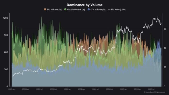 นักวิเคราะห์ชั้นนำ Maartunn แบ่งปันข้อมูลที่เน้นว่า Ethereum ยังคงเป็นผู้นำในปริมาณการซื้อขายเมื่อเทียบกับ bitcoin และ altcoins อื่น ๆ แม้จะมีความผันผวนล่าสุด สิ่งนี้สะท้อนให้เห็นถึงการครอบงำของ ETH ในกิจกรรมการตลาดและผลประโยชน์ของนักลงทุนซึ่งเป็นการเสริมบทบาทในฐานะสินทรัพย์ชั้นนำในปัจจุบัน รอบ– ในขณะที่ความเสี่ยงระยะสั้นของการแก้ไขยังคงอยู่พื้นฐานที่แข็งแกร่งและกิจกรรมการซื้อขายสามารถปูทางสำหรับขาถัดไปของ Ethereum สูงขึ้นเมื่อโมเมนตัมผลตอบแทน