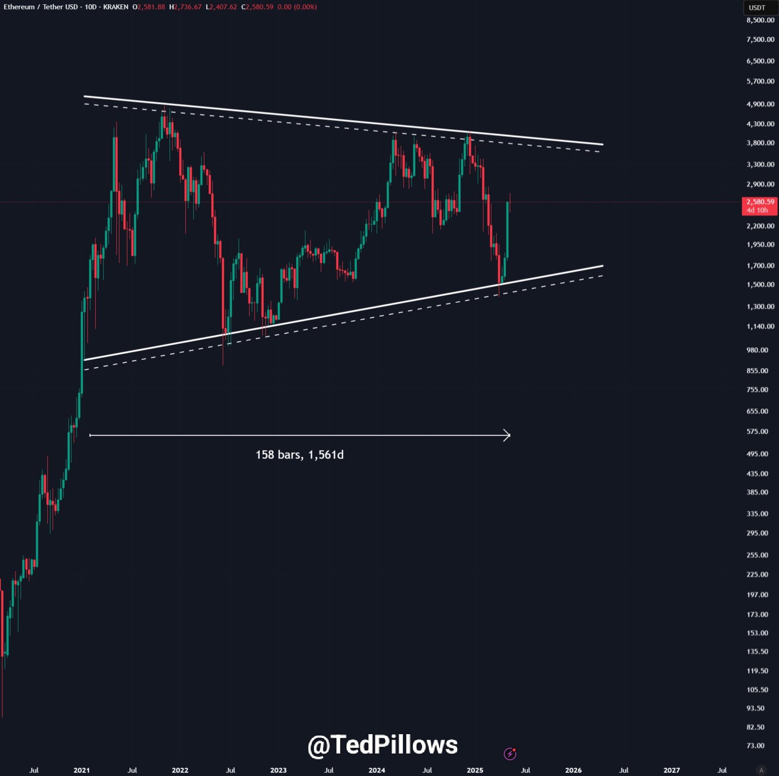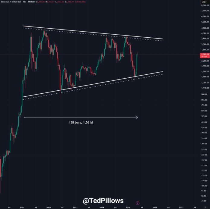 ตามหมอนเท็ดพบว่า $ 4,000 สามารถอธิบายได้ว่าเป็นภูมิภาคราคาที่สำคัญสำหรับ Bulls ETH ตามข้อมูลราคาในอดีต โดยเฉพาะอย่างยิ่ง Ethereum ได้ทำการซื้อขายภายในก สามเหลี่ยมสมมาตรขนาดใหญ่ นั่นเริ่มขึ้นในไตรมาส 3 ปี 2020 และใช้เวลานานกว่า 1,500 วัน ปัจจุบันระดับราคา $ 4,000 อยู่ต่ำกว่าขอบเขตบนของสามเหลี่ยมนี้ซึ่งเป็นตัวแทนของการต่อต้านอย่างมีนัยสำคัญต่อการเพิ่มขึ้นของราคา
