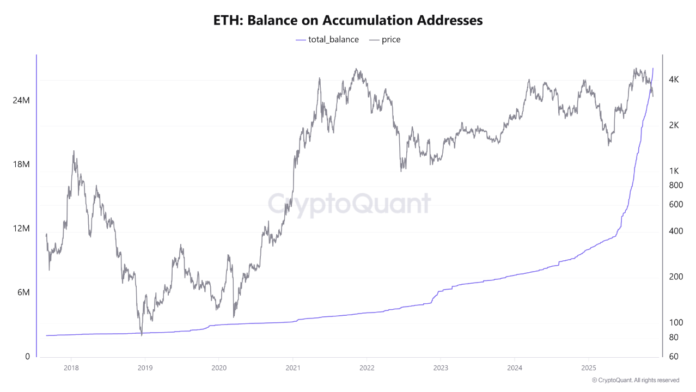 ในความเป็นจริง ในปี 2025 มี ETH ประมาณ 17 ล้าน ETH ไหลเข้าสู่ที่อยู่สะสม ทำให้ยอดคงเหลือทั้งหมดที่ถือโดยกระเป๋าเงินเหล่านี้จาก 10 ล้านเป็นมากกว่า 27 ล้าน ETH แนวโน้มนี้เน้นให้เห็นถึงความเชื่อมั่นของนักลงทุนที่แข็งแกร่งที่สุดของ Ethereum ซึ่งมองว่าการขายหุ้นที่ขับเคลื่อนด้วยความกลัวเป็นโอกาสซ้ำแล้วซ้ำเล่า