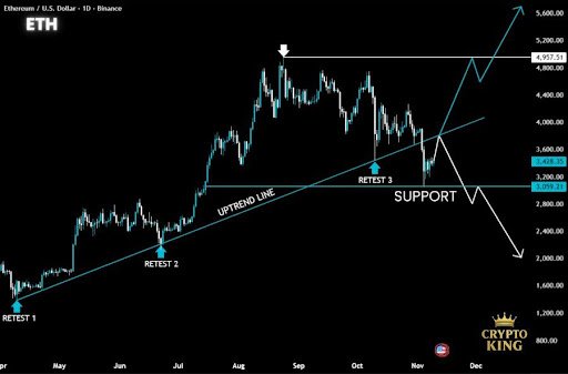 ใน โพสต์Crypto King ชี้ว่าเส้นแนวโน้มขาขึ้นหลักได้รับการทดสอบอีกครั้ง ผู้เชี่ยวชาญอธิบายว่าผลลัพธ์ของการทดสอบนี้จะเป็นตัวกำหนดทิศทางต่อไปของ Ethereum หรือจะเป็นการยืนยัน รั้น ความต่อเนื่องหรือการส่งสัญญาณถึงจุดเริ่มต้นของการแก้ไขที่ลึกยิ่งขึ้น