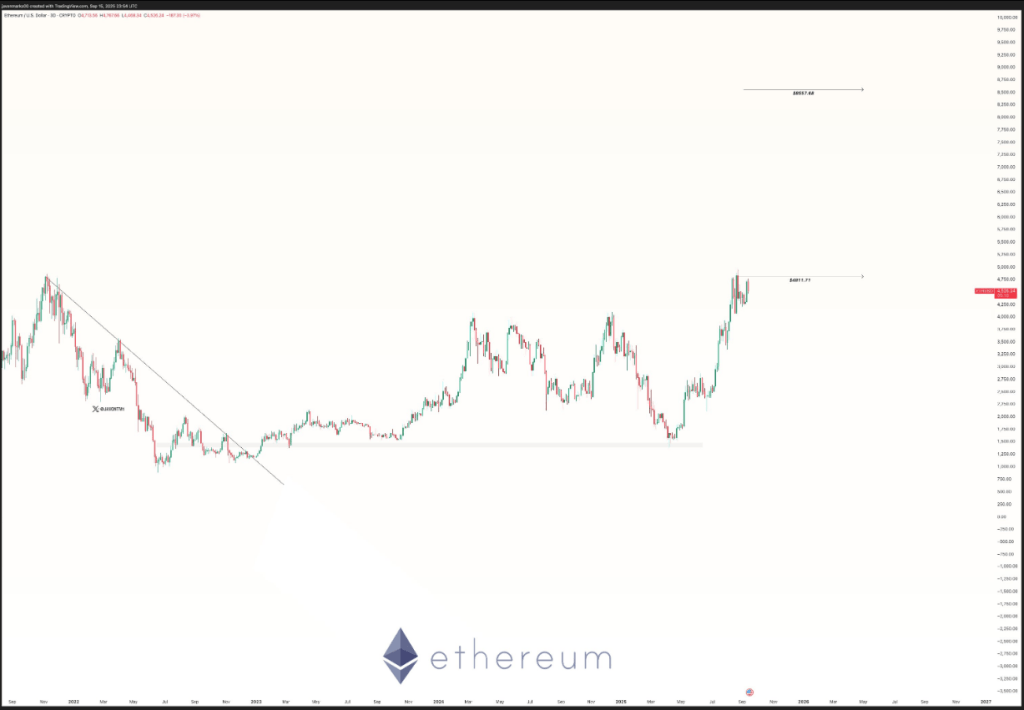 Ethereum’s current buying and selling band has been roughly within the $4,400–$4,600 vary in lots of charts, which implies important upside could be required to succeed in the lofty targets being mentioned.