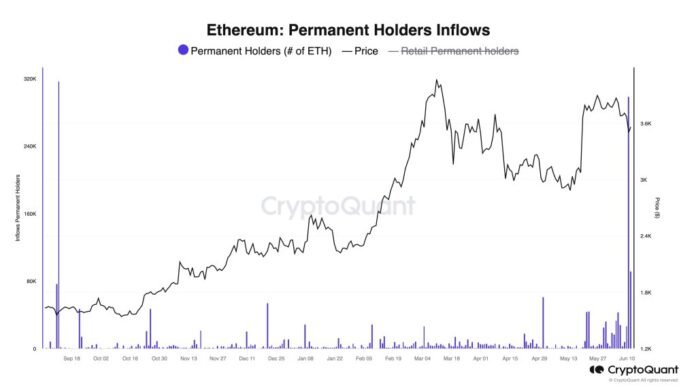 นักวิเคราะห์อ้างถึงข้อมูล CryptoQuant ว่าผู้ถือถาวรเหล่านี้ตามบันทึก มีหน้าที่รับผิดชอบในการซื้อรายวันสูงสุดเป็นอันดับสอง เมื่อวันที่ 12 มิถุนายน เมื่อราคาเพิ่มขึ้นในช่วงสั้นๆ พวกเขาซื้อ ETH มูลค่า 298,000 ETH สิ่งที่น่าประทับใจคือตัวเลขนี้ต่ำกว่าระดับสูงสุดตลอดกาลที่ 317,000 ETH ที่ซื้อเมื่อวันที่ 11 กันยายน 2023