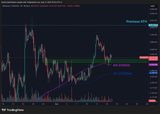 ในการวิเคราะห์ติดตามการซื้อขาย Daan Crypto ที่ได้เสริมกำลัง มุมมองที่รั้นของเขาโดยสังเกตว่า Ethereum เป็นหลักใน“ ห้องรอ $ 5,000” แผนภูมิของนักวิเคราะห์เน้นมุมมองนี้โดยแสดงการตอบสนองอย่างรุนแรงจาก ETH ทดสอบอีกครั้งในภูมิภาค $ 4,400– ด้วยทั้ง 200 MA และ 200 EMA ในแผนภูมิ 4 ชั่วโมงที่ทำหน้าที่สนับสนุนพื้นฐานโครงสร้างของ Cryptocurrency จะปรากฏขึ้นเหมือนเดิมแม้จะมีความผันผวนในระยะสั้น