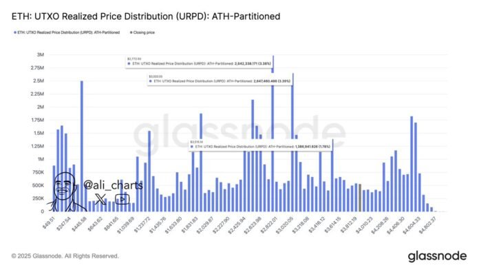 ในโพสต์ 27 กันยายนบนแพลตฟอร์ม X นักวิเคราะห์ Crypto ยอดนิยม Ali Martinez ถูกระบุว่า สามระดับการสนับสนุนที่สำคัญเพื่อดูว่าราคา Ethereum ลดลงในอีกไม่กี่สัปดาห์ข้างหน้าหรือไม่ การสังเกตบนห่วงโซ่นี้หมุนรอบตัวชี้วัดการกระจายราคาของ UTXO (URPD) ซึ่งประมาณจำนวนเงินดิจิตอลเฉพาะที่ได้มาในระดับราคาที่กำหนด