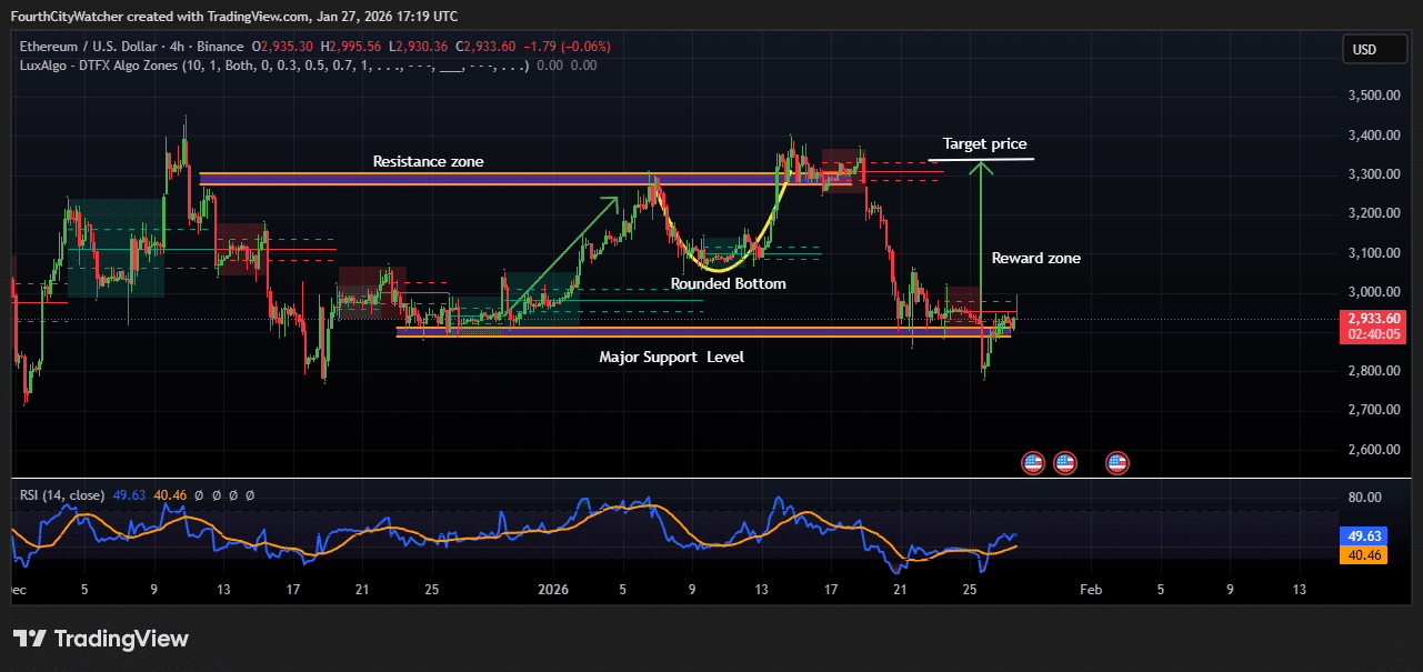 Ethereum value reveals indicators of restoration after latest consolidation close to a significant help degree round $2,850. The 4-hour chart signifies that ETH is trying to stabilize after a pullback from the $3,250 resistance zone. Technical indicators present a doable bounce towards the reward zone with an preliminary goal value close to $3,300, as bulls intention to reclaim earlier highs.