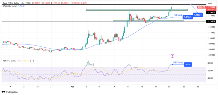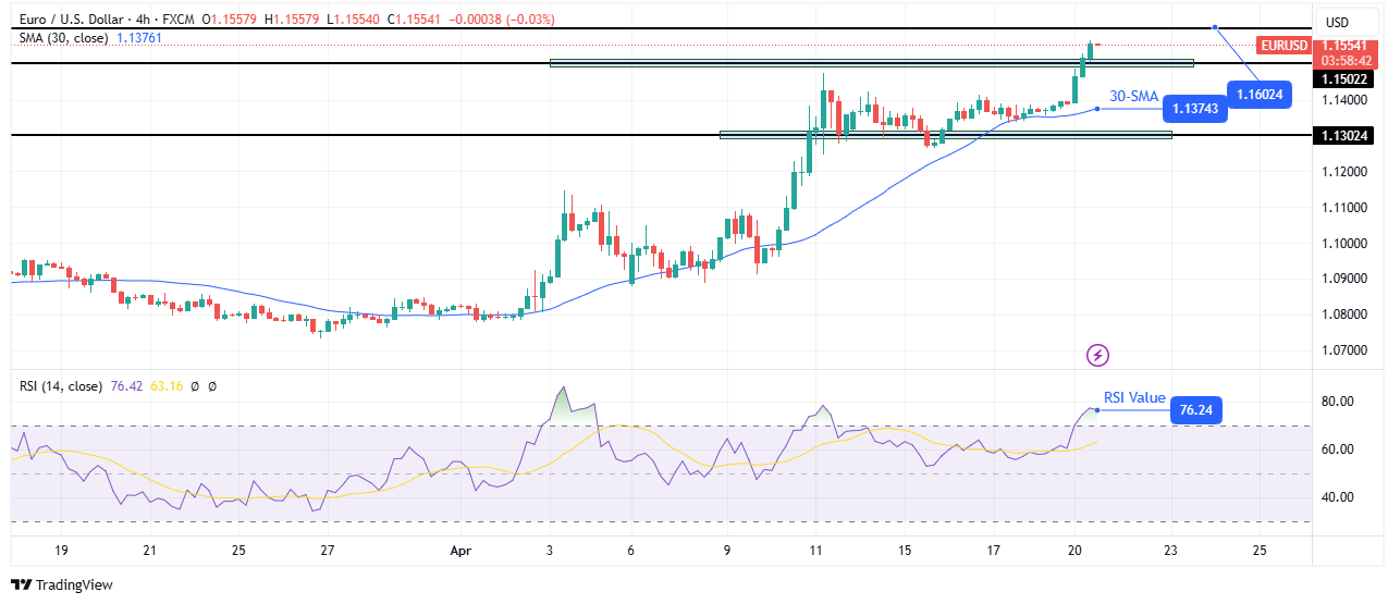 ในด้านเทคนิคราคา EUR/USD ได้เพิ่มขึ้นและแตกเกินระดับความต้านทาน 1.1502 การเคลื่อนไหวดังกล่าวมาถึงระดับสูงใหม่และเสริมสร้างอคติรั้น ราคาตอนนี้ซื้อขายได้ดีกว่า 30-SMA โดยมี RSI ในภูมิภาคที่สูงเกินไป สิ่งนี้แสดงให้เห็นถึงแนวโน้มขาขึ้นที่แข็งแกร่ง
