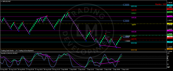 ทีนี้มาดูด้านแผนภูมิ ในการตั้งค่า RENKO GBP/USD M67 พร้อมระดับเดือยรายสัปดาห์รูปภาพมีความชัดเจน: