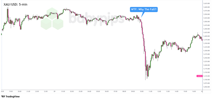 ในวันเดียว ทองคำก็เหวี่ยงไปมามหาศาล ช่วง $500– ทำสถิติสูงสุดใกล้ตัว 5,600 ดอลลาร์ต่อออนซ์ ในช่วงเช้าก่อนจะพังลงมาเกือบ 9% เหลือประมาณ 5,100 ดอลลาร์ ในระหว่างชั่วโมงการซื้อขายของสหรัฐฯ จากนั้นฟื้นตัวจากการขาดทุนบางส่วนเพื่อปิดตัวลง 5,330 ดอลลาร์.