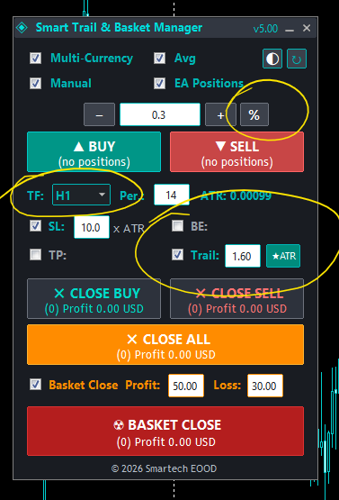 • การควบคุมที่เข้มงวดมากขึ้น: คุณสามารถซื้อขายบนกราฟ H1 ได้ แต่ตั้งค่าแหล่งที่มาของ ATR เป็น M15 เพื่อให้เปิดใช้งาน Trailing ก่อนเวลาที่เข้มงวดยิ่งขึ้น