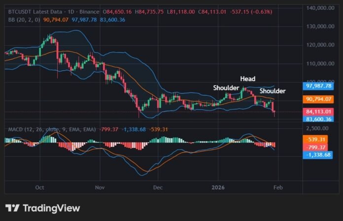 Technically, the breakdown appears to be like extreme. Bitcoin confirmed a head-and-shoulders sample on the each day chart after dropping the $86,400 neckline, which accelerated promoting as worth slipped beneath the 0.236 Fibonacci retracement and signaled a failed protection of a key help zone.