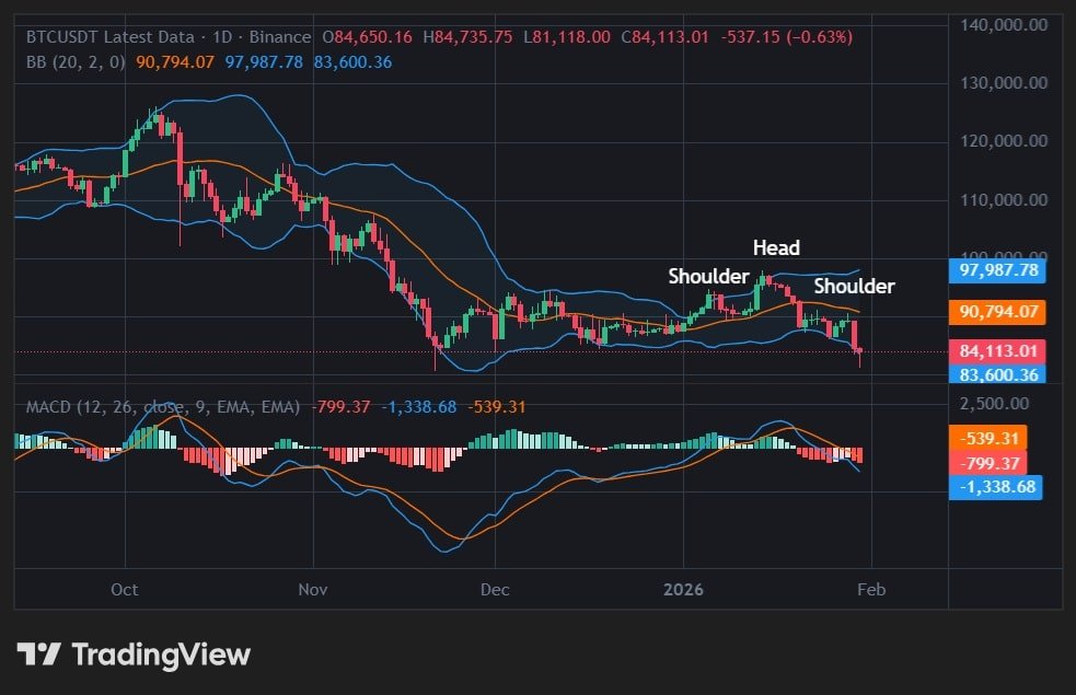 If patrons fail to carry this zone, worth may slide towards the $74,000 to $78,000 vary, whereas a swift reclaim of the $86,400 neckline would invalidate the bearish setup and will set off a brief squeeze towards $92,219.