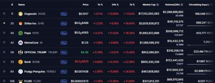 Based mostly on present CoinMarketCap knowledge, Shiba Inu holds its place because the second-largest finest meme coin in the crypto market. Its market capitalization sits close to $4.1 billion, which locations it at roughly one-fifth the dimensions of Dogecoin’s valuation.