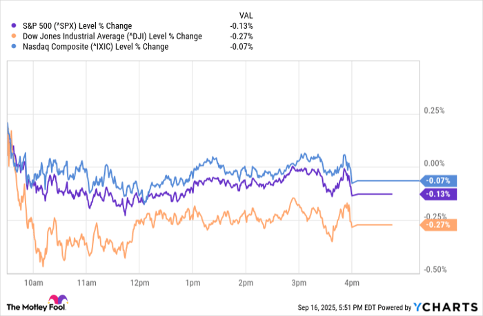 The S&P 500 (SNPINDEX: ^GSPC) dipped 0.13% to six,606.76, the Nasdaq Composite (NASDAQINDEX: ^IXIC) misplaced 0.07% to 22,333.96, and the Dow Jones Industrial Common (DJINDICES: ^DJI) dropped 0.27% to 45,757.90. The pullback from current highs mirrored rising warning round inflation and labor-market alerts simply earlier than the Fed’s assembly.