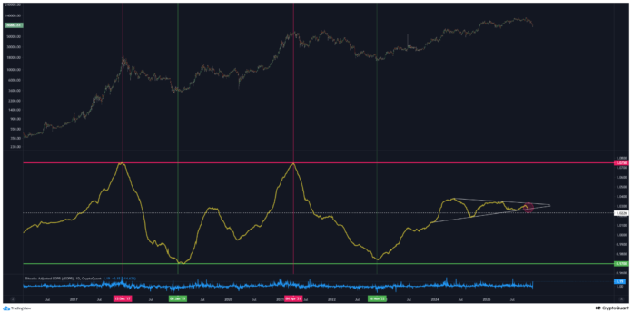 As identified by an analyst in a CryptoQuant Quicktake publish, the Bitcoin aSOPR has been consolidating between converging trendlines for almost two years. The Spent Output Revenue Ratio (SOPR) is an indicator that tells us whether or not the BTC traders are promoting their cash at a revenue or loss.