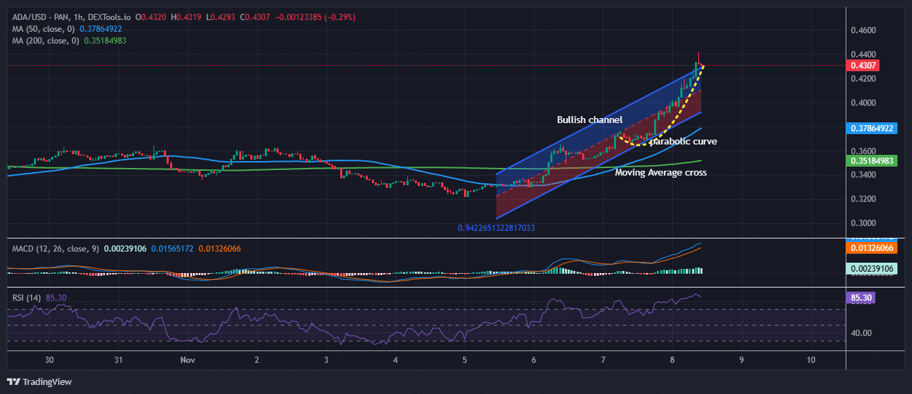 The ADA/USD 1-hour chart reveals a powerful bullish pattern, with the present worth round $0.4307 after reaching a current excessive of $0.4329 and a low of $0.4293.